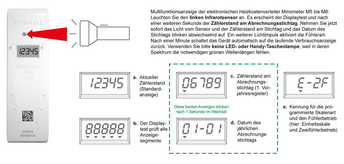 Um den Verbrauch abzulesen, genügt es, den linken Infrarotsensor im oberen Teil des Heizkostenverteilers kurz anzuleuchten. Dadurch wird zunächst ein Anzeigetest mit allen Segmenten des Displays durchgeführt. Nach einer Sekunde wird der Verbrauchswert seit dem letzten programmierten Stichtag angezeigt. Anschließend wird die Lichtquelle entfernt und die Vorjahresanzeige sowie der Stichtag blinken abwechselnd. Nach einer Minute kehrt das Gerät zur laufenden Verbrauchsanzeige zurück.